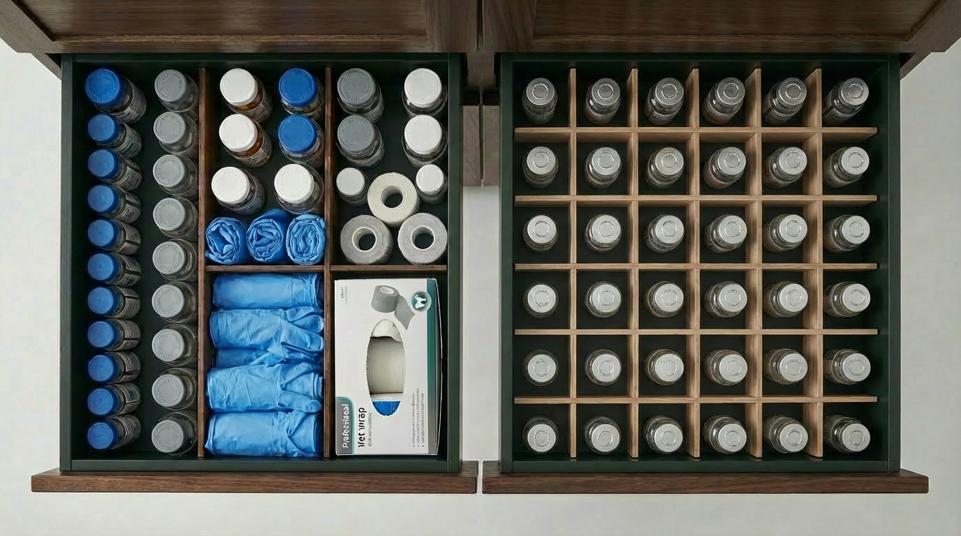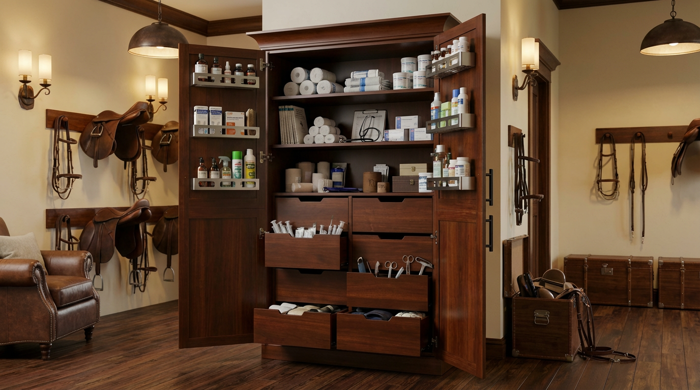 Designed for the realities of daily horse care, this built-in vet cabinet brings quiet precision and refined craftsmanship to the heart of your tack room. Every detail is purpose-built to store veterinary supplies, medications, syringes, and essentials in a clean, organized, and secure environment. so nothing is ever misplaced when timing matters. Integrated cabinetry elevates function without visual clutter, seamlessly blending into your tack room while maintaining the elevated aesthetic expected in a world-class barn. This is not a retrofit or an afterthought—it’s a professional-grade solution, designed to support better care, safer storage, and a more efficient barn routine, all wrapped in the elegance of custom craftsmanship.