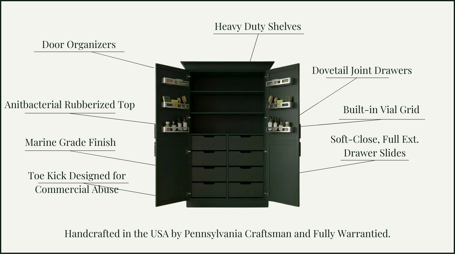 Tack Room Cabinetry was created to bring fine-furniture craftsmanship to the barn environment. Backed by a national cabinet manufacturer with 50+ years of experience, every piece is built in Pennsylvania using an all-U.S. supply chain and materials proven to stand up to time, moisture, and daily use.